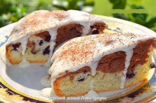 Яйца взбить с сахаром в очень пышную массу, добавить соду и постепенно муку. 2/3 теста вылить в форму, в остальное тесто добавить какао. Поверх белого теста выложить ягоды, обваленные в муке, и темное тесто хаотично. Печь при 170-180* 20-30мин (проверить спичкой). Для крема перемешать сметану с сахаром и оставить до растворения сахара. Корж остудить, можно разрезать и пропитать, промазать кремом, я просто сверху полила.