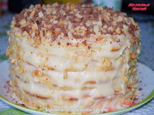 Тонко раскатать, наколоть вилкой, чтоб не вздувались. Печь до того как зарумянится на сухой сковороде с двух сторон. Обрезать неровные края. Остудить. Сливочное масло взбить миксером, постепенно добавляя заварную массу холодную. Смазать коржи, пересыпая орехами(по желанию). Сверху украсить крошкой от обрезки коржей, орехами и тертым шоколадом. Оставить пропитываться не меньше, чем на 6 часов.